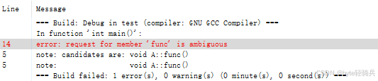 错误分析:D的对象d中包含B和C的子对象,而B和C各自包含A的子对象。因此,d中存在两份A的拷贝(B::A和C::A)。当调用d.func()时,编译器无法确定调用的是B::A::func()还是C::A::func(),导致歧义。