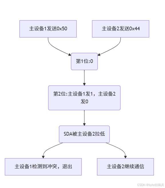 - 软件实现仲裁:主设备在发送每一位后,读取 SDA 的实际电平,与自己发送的位比较;
