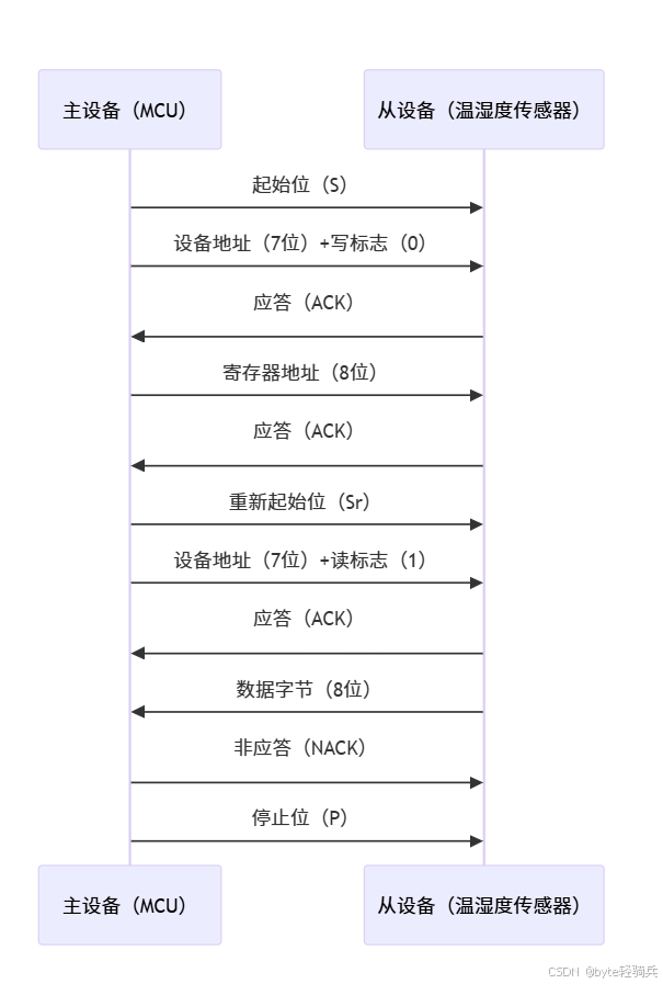 - 寄存器地址(8 位):主设备发送目标寄存器地址(如 0x00,温湿度数据寄存器);