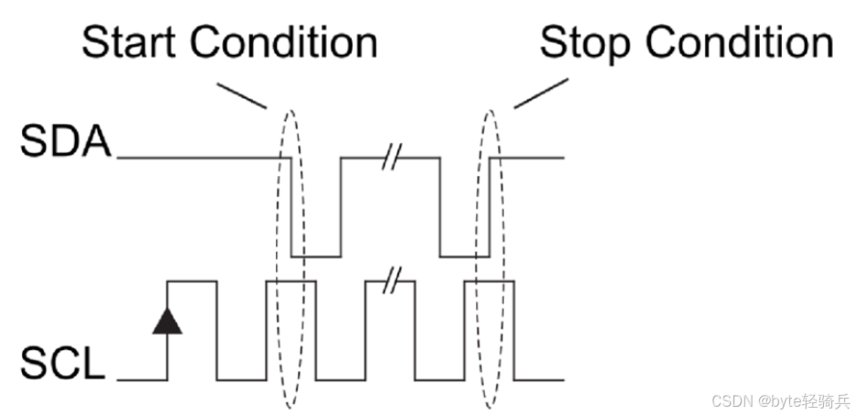 - 条件:SCL 保持高电平期间,SDA 从高电平跳变到低电平。