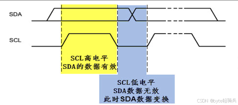 I²C 的每个数据位(0 或 1)的传输严格遵循 “高电平读,低电平变” 的规则: