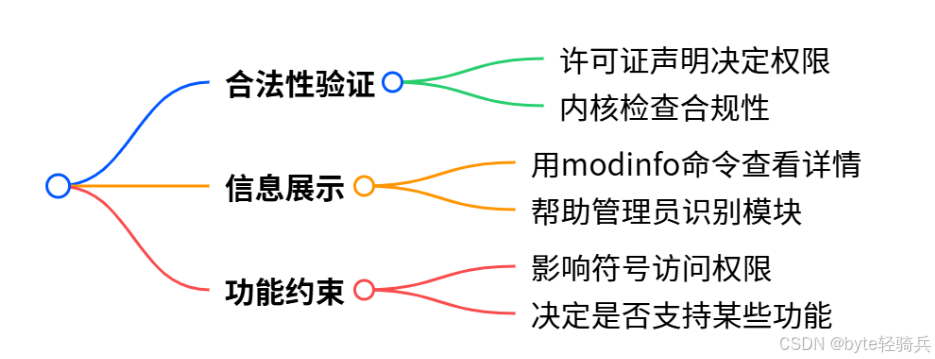 这些信息都通过模块声明来传递,缺少关键声明的模块,内核会拒绝接待(限制功能或直接加载失败)。