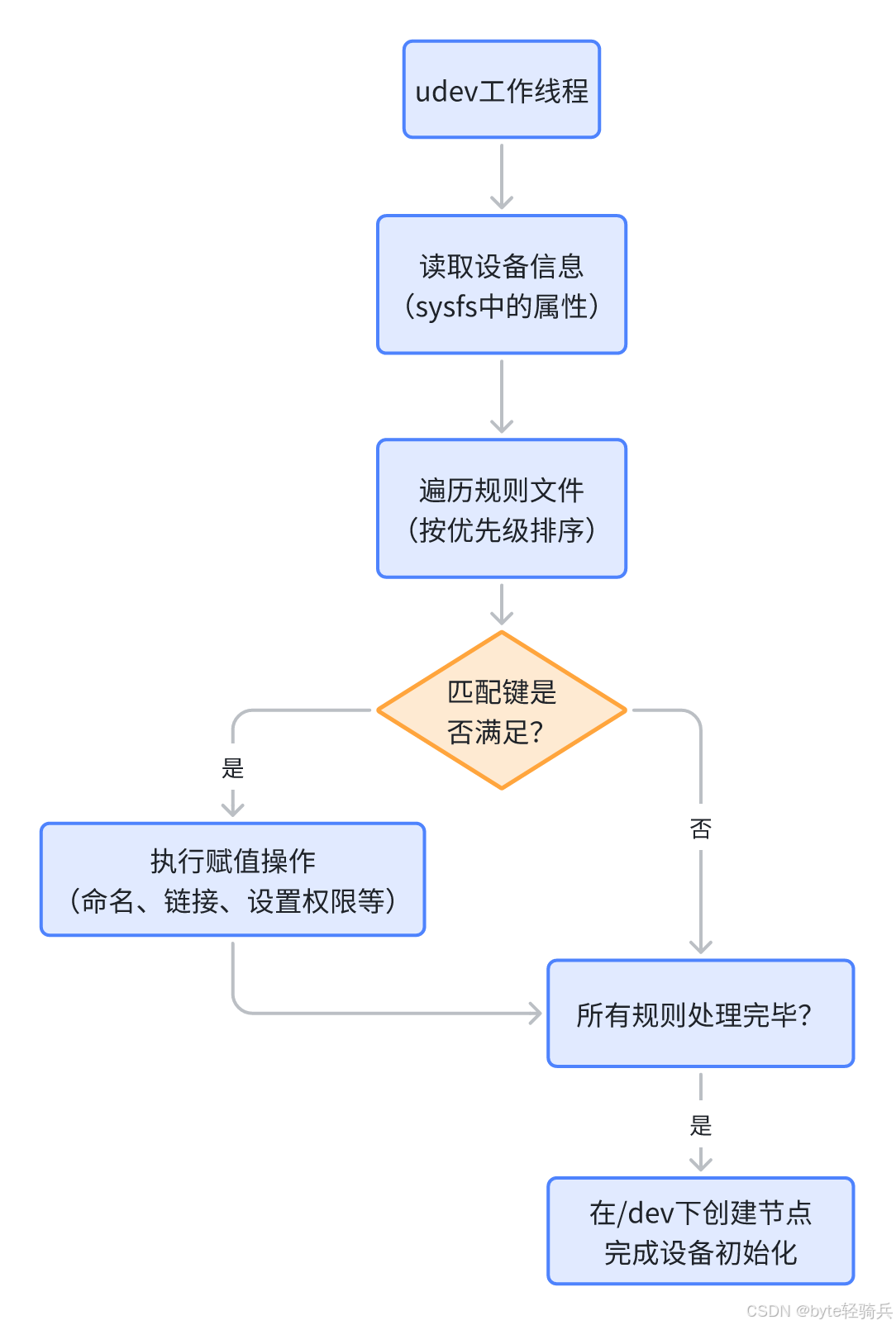SUBSYSTEM=="usb", ATTR{idVendor}=="0a12", ATTR{idProduct}=="0001", SYMLINK+="my_usb_device", MODE="0666"规则是如何被“工人”执行的呢?我们结合下图来看: