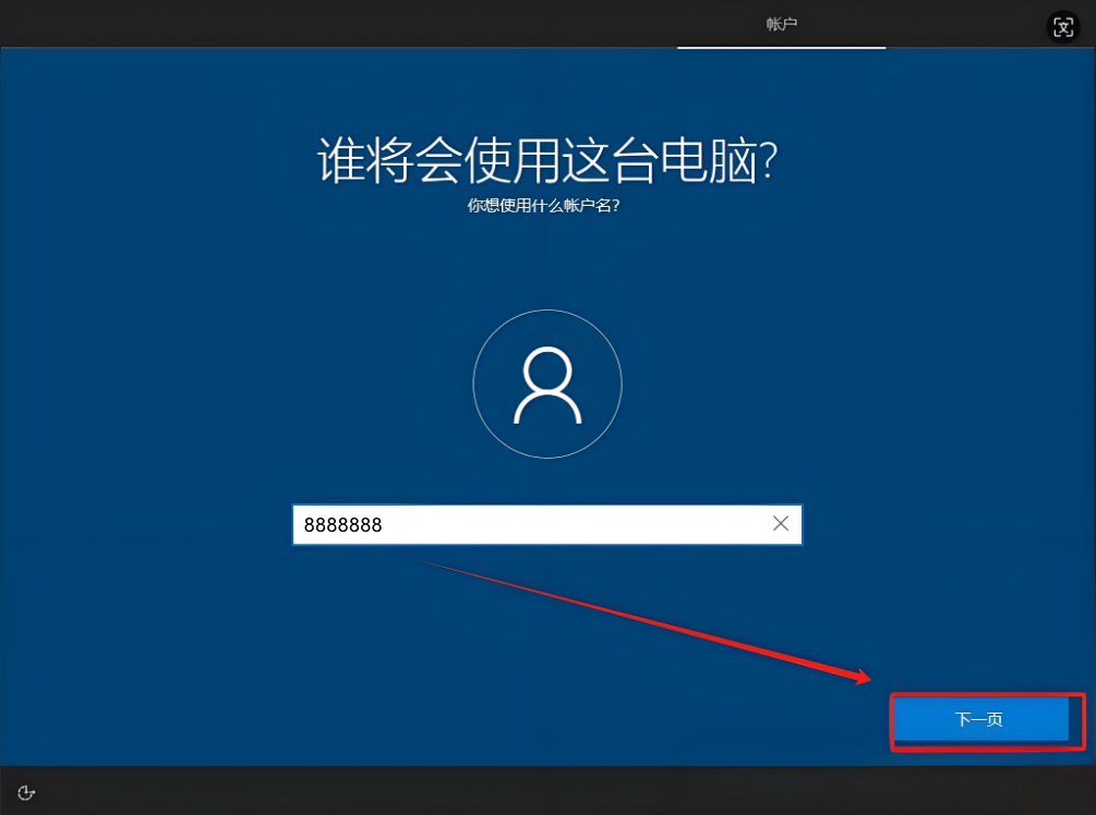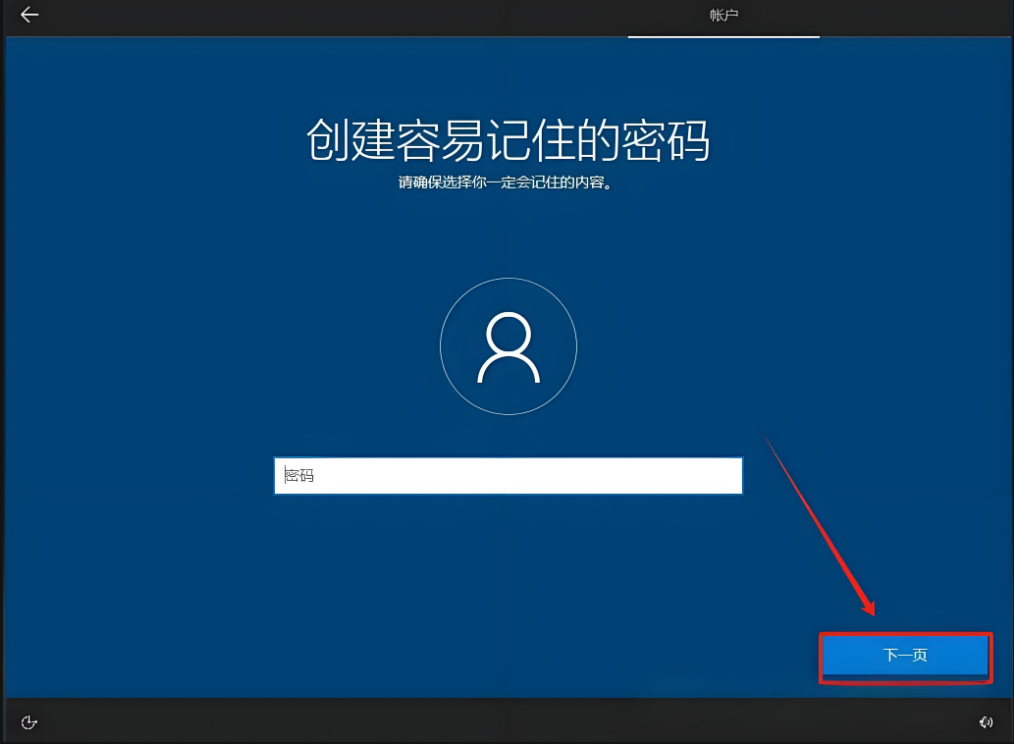 设置账户密码(电脑开机时需要此密码),如果不需要直接点击【下一步】跳过