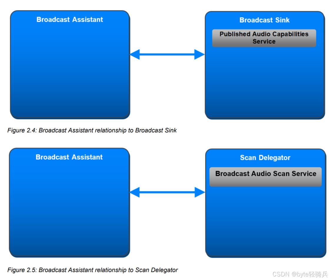 Broadcast Assistant :扫描时使用GAP Observer/Central角色(发现广播源和Scan Delegator),建立连接时使用GAP Central角色(主动连接Scan Delegator);
