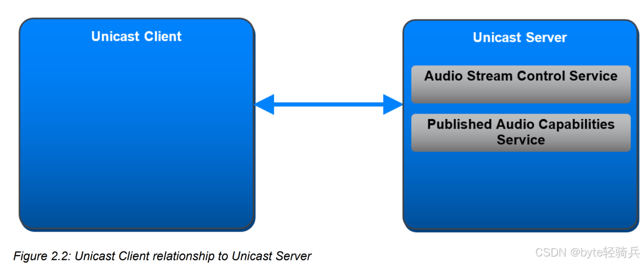 2.1 单播场景:一对一的精准协作 单播场景面向一对一音频传输(如手机连耳机、电脑连音箱),核心角色是Unicast Server和Unicast Client 。
