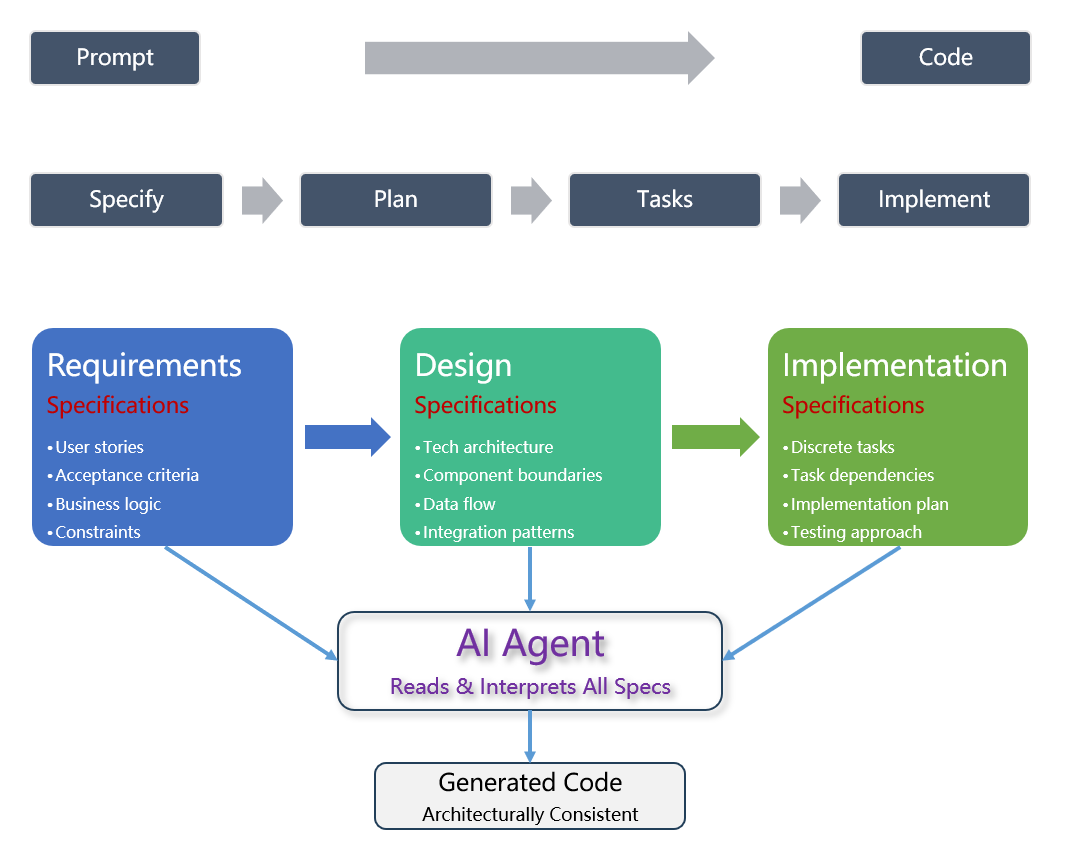 从Vibe-Coding高速产生代码带来的眩晕之后,原型是可用的,但如何让氛围生成的代码真正支撑起大规模生产级别的应用成为挑战。 接下来,社区演化出来的Spec-Driven开发方法的策略是以规范为中心来控制交付的节奏和颗粒度。