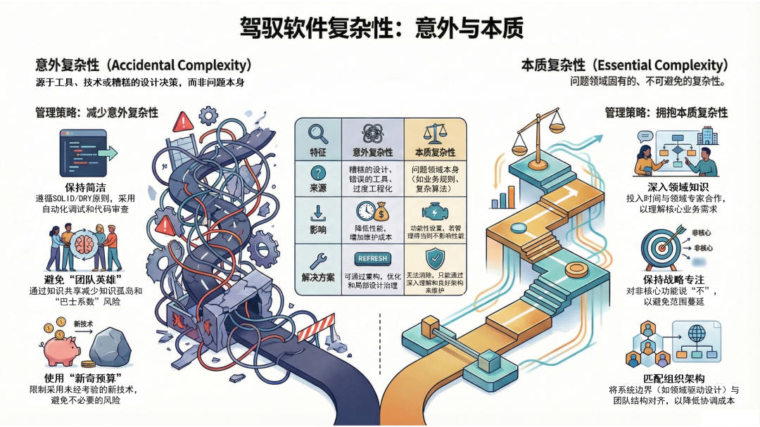 如上所述,本质复杂性(Essential Complexity)是问题领域本身固有的、不可削减的挑战,只要试图解决该特定问题,这种复杂性就必须存在于软件的概念结构中。 为了有效管理这种复杂性,核心策略在于“拥抱本质复杂性”,通过深入领域、保持专注以及调整组织来应对。
