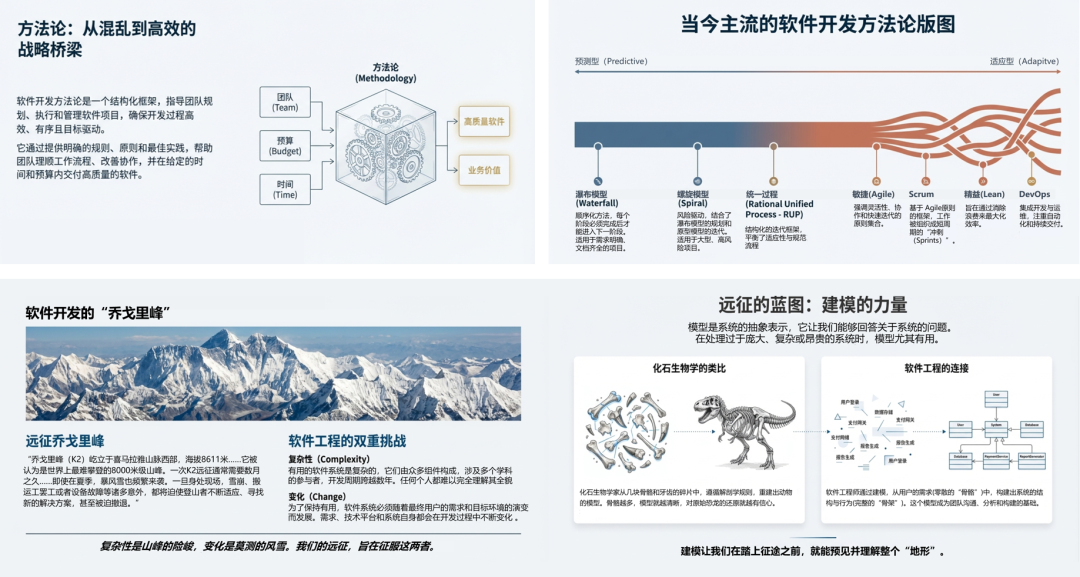 为应对各种复杂性和风险,经典软件工程方法经历了从“强控制”到“渐进式交付”的演变。演化过程中产生出各类开发方法轮,但核心流程基本相近。