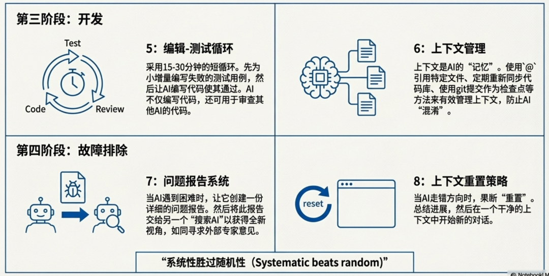 实现 | TDD (测试驱动开发) | Test-Driven Prompting:先描述期望的 Test Case,让 AI 填充实现,极速缩短反馈路径。 |