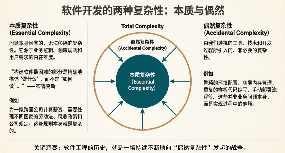 这里,软件工程的核心使命: 通过工具和流程演进,将“偶然复杂性”降至最低,从而让开发者能够集中精力攻克和治理“本质复杂性”。