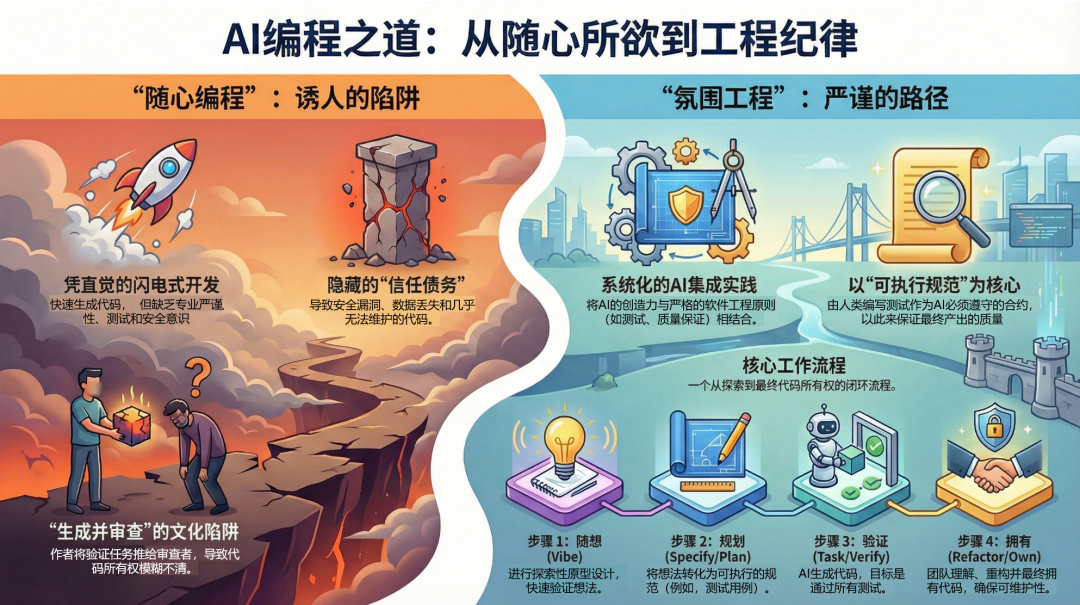 “Vibe Coding”虽然极速,但若没有“Engineering”的约束,最终会演变成难以维护的“代码泥潭”。 我们需要超越它,进入 意图指引+规范控制 的融合阶段。