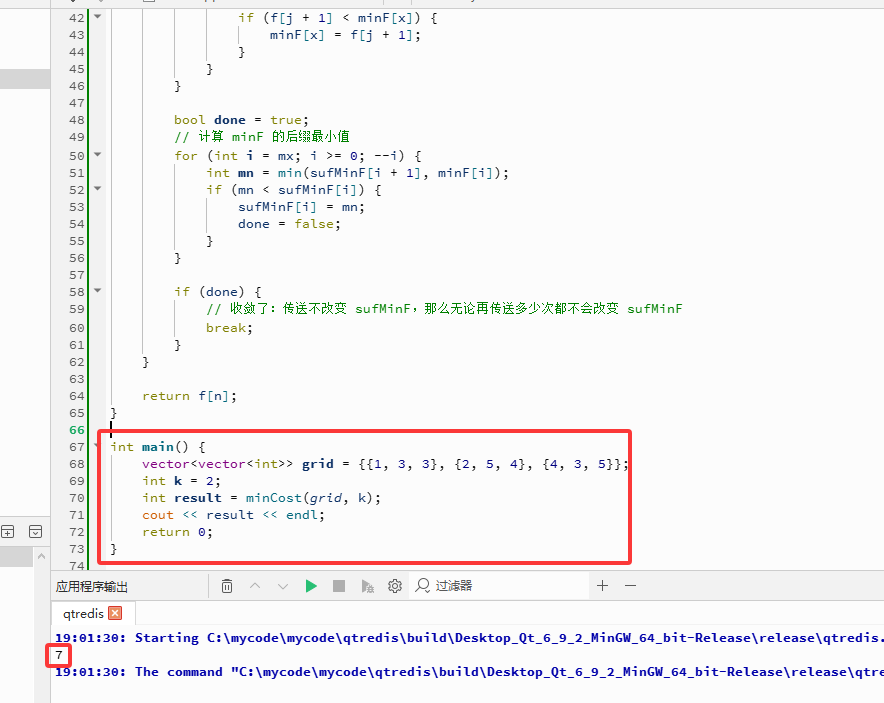 m 和列数 n。它进行了一项关键检查:如果允许传送(k > 0)并且起点的值大于终点的值(grid[0][0] > grid[m-1][n-1]),则可以直接从起点传送到终点,总成本为0,算法直接返回0。这是因为传送规则允许跳到任意数值不大于当前格子的格子,且不消耗代价。mx,这定义了问题中格子数值的范围。