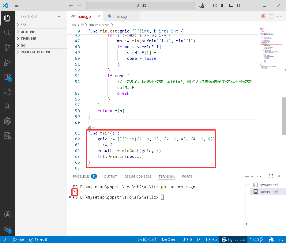 2026-01-19:带传送的最小路径成本。用go语言,给定一个 m×n 的整数矩阵 grid 和一个整数 k。起点是左上角格子 (0,0),终点是右下角格子 (m−1,n−1)。你可以用两种方式前进: