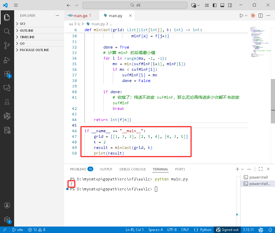 接着,初始化三个关键数组:sufMinF: 大小为 mx+2。sufMinF[x] 用于记录在当前迭代中,到达某个格子后,能够通过一次传送到达所有数值小于等于 x 的格子所需的最小累计成本。初始时,其每个元素被设置为一个极大值(math.MaxInt)。minF: 大小为 mx+1。在当前行的计算过程中,minF[x] 临时记录到达当前行某个数值为 x 的格子的最小累计成本。每次计算新的一行前会被重置为极大值。f: 大小为 n+1。这是一个动态规划数组,用于进行空间优化的路径计算。f[j] 代表在当前行,到达第 j 列格子的最小累计成本(注意索引偏移,f[1] 对应第0列)。k+1 次迭代(因为最多可以使用 k 次传送,包括0次)。每次迭代包含两个主要阶段:动态规划计算当前路径成本和更新传送优化信息。f 进行空间优化:f 为极大值,并设置 f[1] = -grid[0][0]。这是因为起点(左上角)的成本不计入(根据题目描述,代价等于“进入的那个格子的数值”,起点是出发点,不应算作“进入”)。i:j 和对应的格子值 x:f[j+1] 的新值。它考虑两种移动方式:f[j] + x。f[j+1] + x(这里的 f[j+1] 是上一行同一列的值,在遍历过程中被保留)。sufMinF[x],它代表了在之前的状态下,通过一次传送到达数值为 x 的格子的最小成本。f[j+1] 取这三种情况的最小值。f 值后,更新 minF 数组:对于当前行的每个数值 x,minF[x] 更新为所有数值为 x 的格子的 f 值中的最小值。minF 来更新 sufMinF,为下一次迭代(即多使用一次传送)做准备。sufMinF[i] 被更新为 min(sufMinF[i+1], minF[i])。这个操作是从大到小遍历数值,计算 sufMinF 的后缀最小值。其物理意义是:sufMinF[x] 现在表示,在本轮迭代后,可以通过一次传送到达数值 小于等于 x 的任意格子的最小成本。sufMinF 数组是否在本轮迭代中发生了变化。如果没有变化(done 为 true),说明传送操作已经无法提供更优的路径,提前终止迭代。f 的最后一个元素 f[n] 就包含了到达终点(右下角)的最小总成本,将其返回。k 次迭代。m x n 的网格,复杂度为 O(m * n)。minF 数组(大小为 mx)来更新 sufMinF,复杂度为 O(mx)。mx 是网格中数值的最大值,在本题约束下(grid[i][j] <= 10000),mx 是一个常数上限(10000),但仍然是复杂度分析中的一个因子。sufMinF 数组(O(mx))、minF 数组(O(mx))和动态规划数组 f(O(n))。m x n 的DP表,从而将空间复杂度降低到与网格维度无关的水平。这个算法的核心思想是通过多次迭代(模拟使用传送次数)来逐步优化路径成本。在每次迭代中,它先计算不使用额外传送时的基础路径成本,然后利用上一轮迭代得到的传送信息(sufMinF)来更新当前路径成本的可能性。通过维护基于格子数值的代价后缀最小值数组,高效地捕捉了传送操作带来的优化效果。