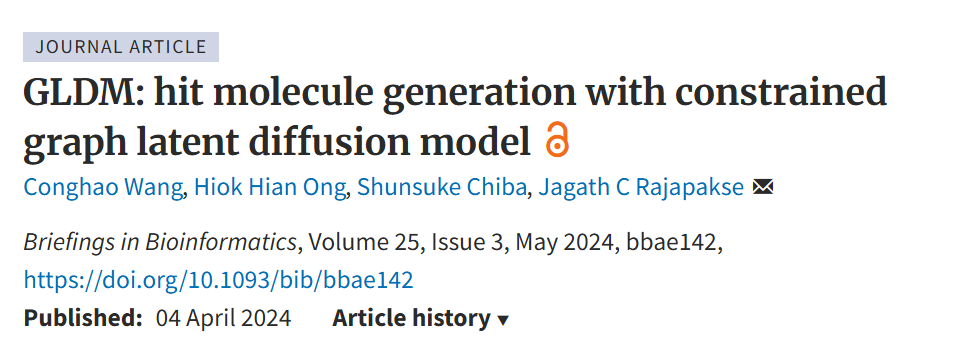 参考文献:Conghao Wang, Hiok Hian Ong, Shunsuke Chiba, Jagath C Rajapakse, GLDM: hit molecule generation with constrained graph latent diffusion model, Briefings in Bioinformatics, Volume 25, Issue 3, May 2024, bbae142, https://doi.org/10.1093/bib/bbae142