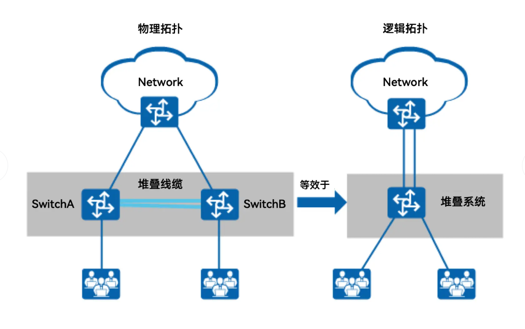 业务口专用堆叠线缆堆叠(免配置) | 仅iStack支持(华为“智简堆叠”方案) | - 专用堆叠线缆(如华为Stack Cable)直接连接业务口,自动识别堆叠模式,无需手动配置- 简化部署流程,适合批量部署场景- 成本低于堆叠卡方案,高于普通业务口堆叠(需采购专用线缆) | - 单链路带宽:10GE/25GE- 堆叠成员数:最多9台- 配置复杂度:零配置(即插即用) | 华为中端智能交换机(S5735、S6735系列,支持“免配置堆叠”功能) |