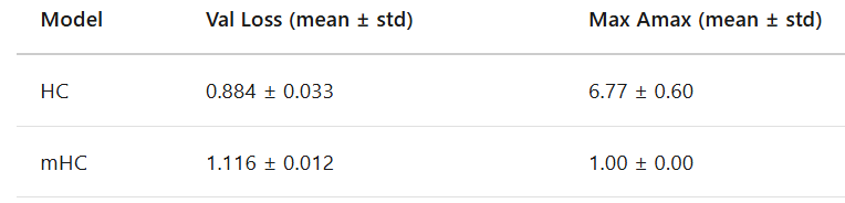 HC 的第 0 层(可视化图表中的顶行)率先变红,随后其混合矩阵在训练初期就突破了 Amax 2.0,而更深层的网络则保持相对稳定。看起来问题不在于深度,而在于第 0 层 —— 这是唯一一层直接吞吐原始输入的层。