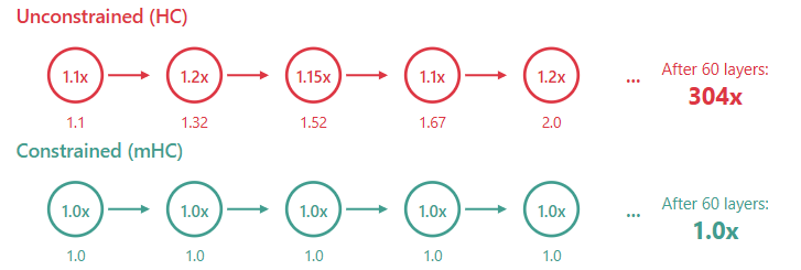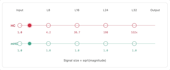 HC 打破了这一规则,任由信号失控螺旋上升,而 mHC 则守住了底线。