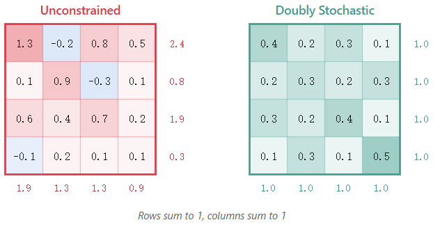 这个过程是可微分的。梯度可以回传穿过所有二十次迭代。网络学习原始权重 H,而 Sinkhorn 确保实际的混合矩阵始终是双重随机的。