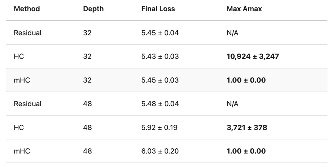 在激进的学习率下,作者的复现实验中超连接(HC)的信号放大达到了 7 倍,随后最终崩溃。Amax(行和列绝对值的最大值)衡量了一个矩阵能将信号放大多少。