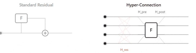 下图对比了标准残差与超连接:
