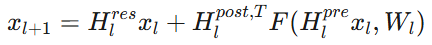 超连接(Hyper-Connections)采取了不同的方法。它不再是单一流,而是扩展到 n 条并行流,并带有可学习的混合矩阵: