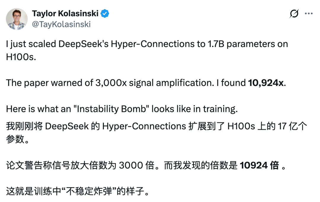 但还有更加硬核的,近日 FlowMode 工程师 Taylor Kolasinski 宣布成功复现了 mHC,并且在测试中还取得了比 DeepSeek 原始论文更好的成绩!