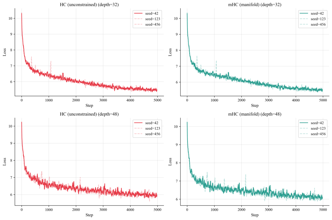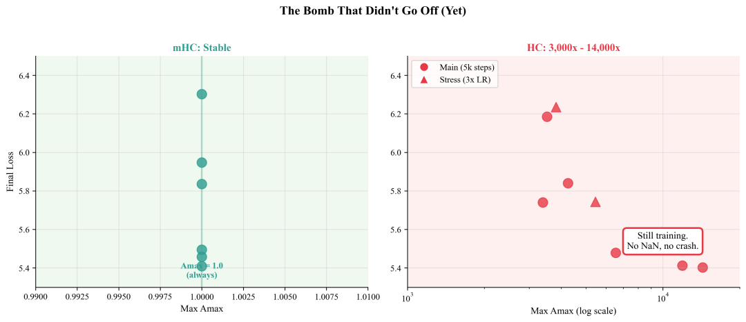 唯一的差别在于模型内部正在发生的事情:HC 在不断积累不稳定性,这种不稳定性可能在任何时刻被引爆;而 mHC 则始终维持着自身的结构完整性。
