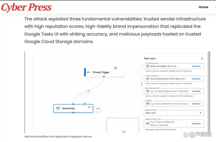 攻击者正是利用上述特性,注册Google Cloud账号后创建恶意工作流:监听外部触发条件(或手动启动),向目标邮箱发送伪造的Tasks通知,并嵌入指向GCS钓鱼页面的链接。