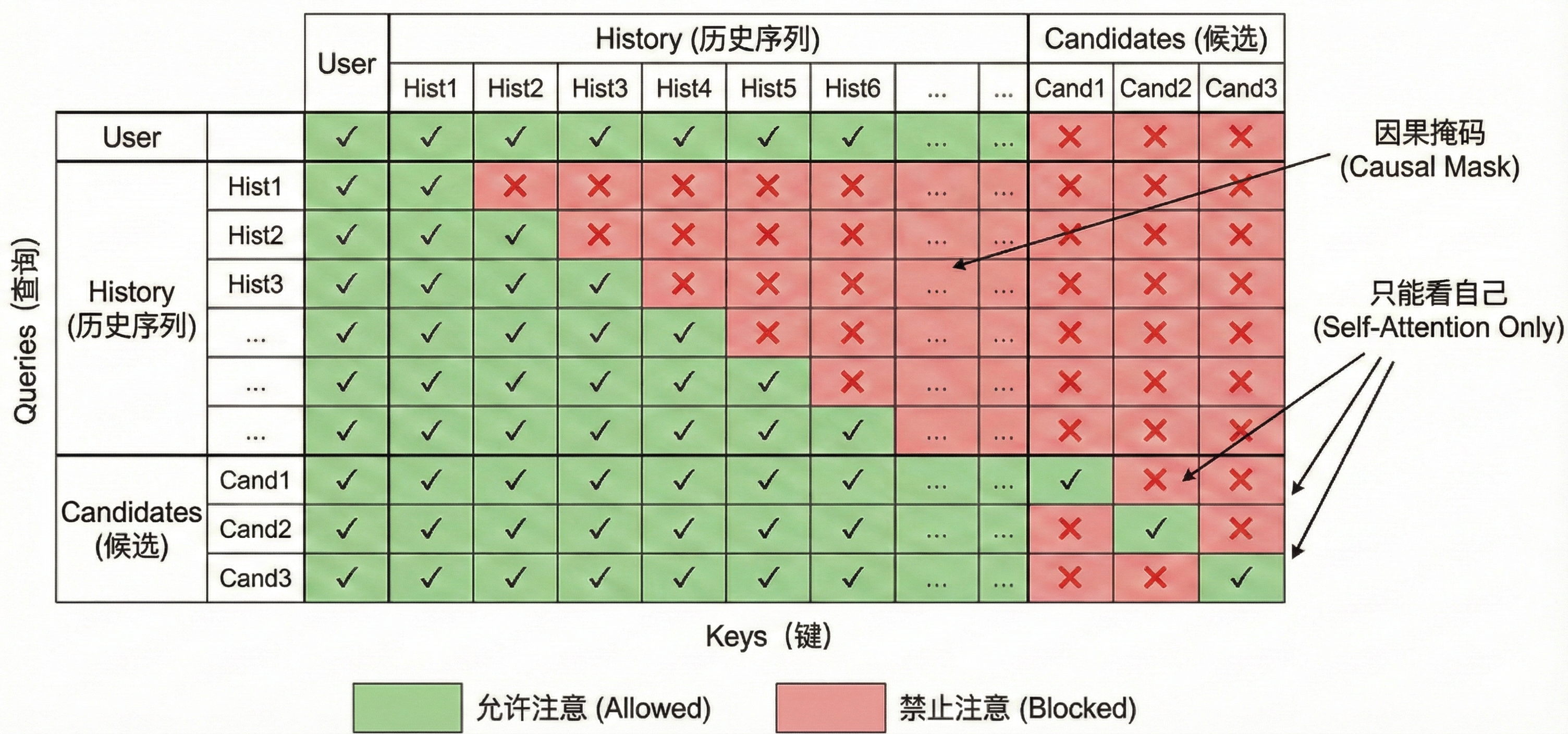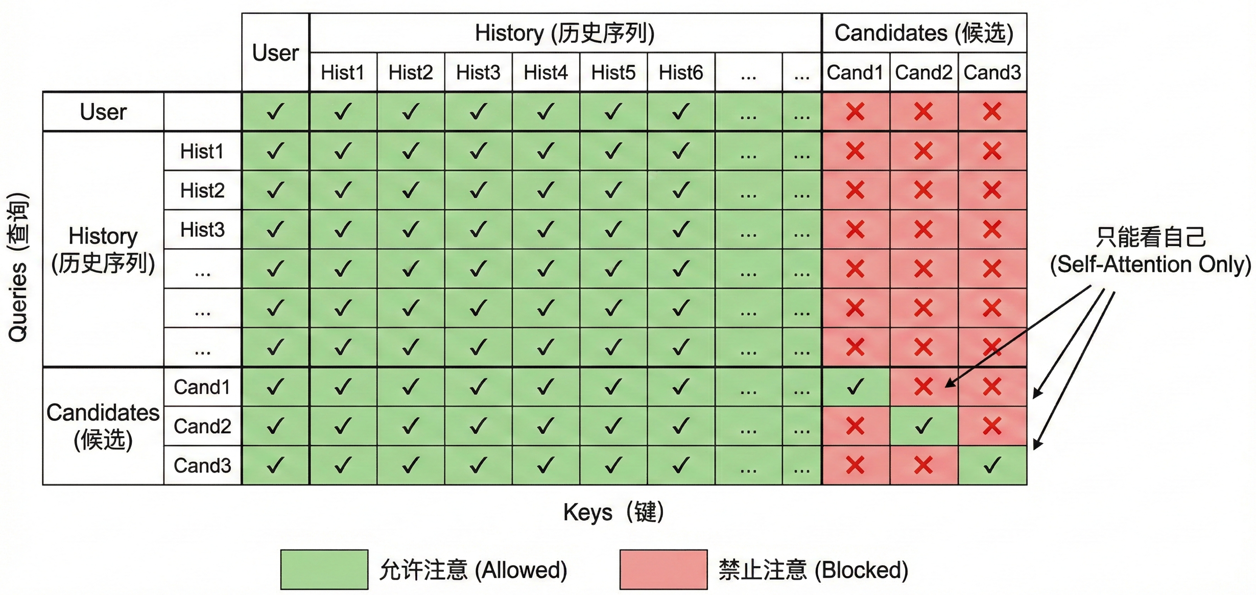 标准 Transformer 的 Self-Attention 会让所有位置互相影响。如果候选之间可以互相 attend,那么候选 A 的分数会受候选 B 影响,因此对于候选集做了mask如下图: