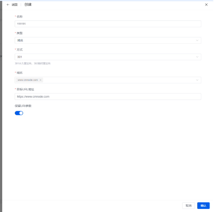 点击创建,名称可以随便取,类型和方式不用改随机的就好了。域名填:域名.com,目标URL地址填:https://www.域名.com.如下图