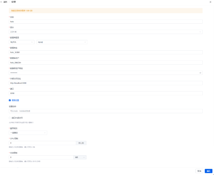 在应用商城找到Halo,点击安装。数据库记得要选择MySQL数据库就可以了,其他的都不用改点击安装就好了。