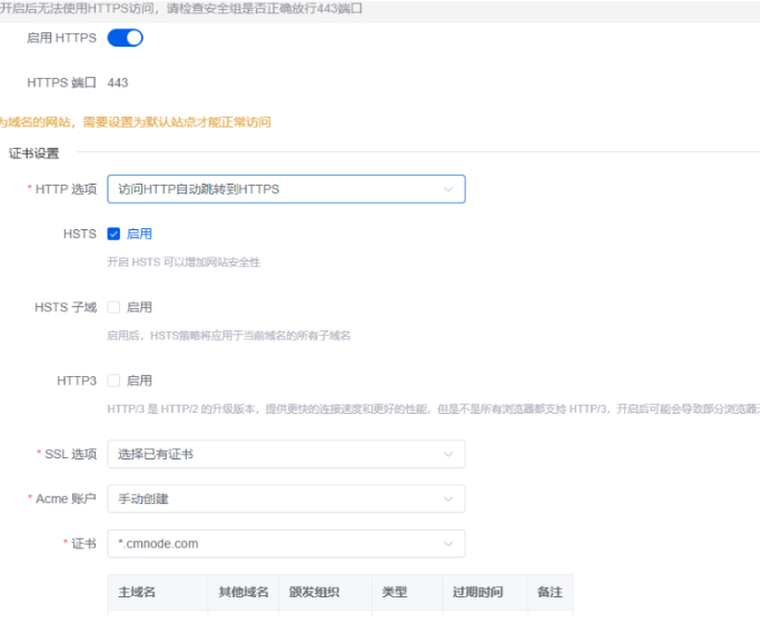 HTTP选项选择:访问HTTP自动跳转到HTTPS,启用HSTS.