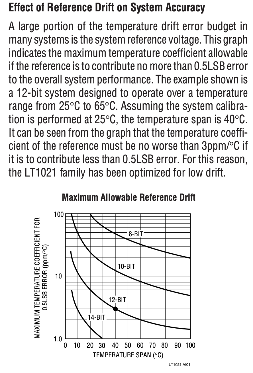 It can be seen from the graph that the temperature coefficient of the reference must be no worse than 3ppm/°C if it is to contribute less than 0.5LSB error.