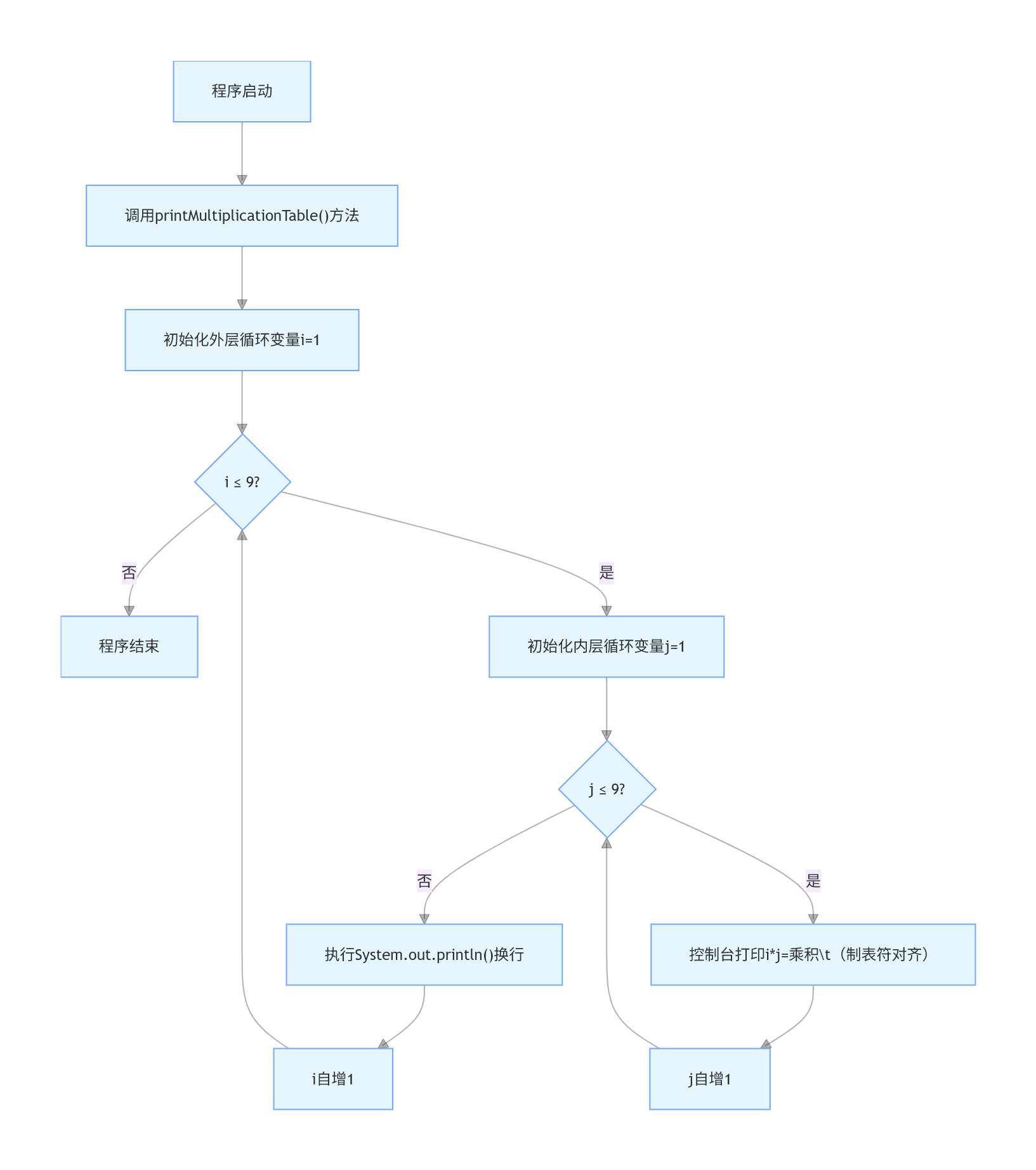 }for (int i = 1; i <= 9; i++) 控制行数。for (int j = 1; j <= 9; j++) 控制每行中的列数。System.out.print(i + "*" + j + "=" + (i * j) + "\t") 来格式化输出每一项。其中\t表示制表符,用于对齐输出。System.out.println()进行换行。