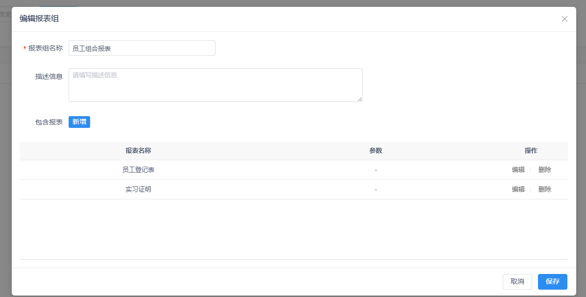 提示:创建报表组合的操作非常简单,只需点击新增按钮即可开始配置。