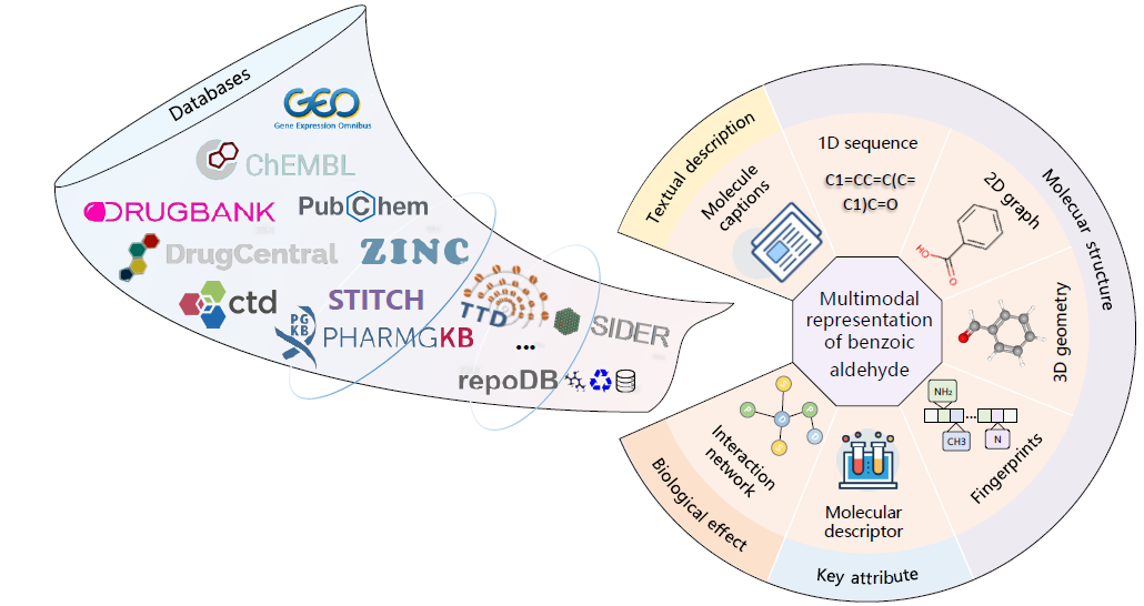 首先,介绍了DrugBank,PubChem、CTD等公开的数据库;其次,介绍了分子的一维序列、二维分子图、三维分子结构、分子描述符、分子相互作用网络、文本描述等多种表示方法,并强调他们之间的不同和联系。