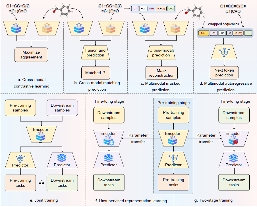 本文总结了药物发现领域中对比学习、多模态匹配预测、掩码预测和自回归预测等四种多模态预训练任务的基本原理和概念,并强调了不同预训练任务之间的差异性以及多模态任务融合的优势。其次,训练策略作为预训练和下游微调阶段之间的桥梁,根据预训练与下游任务的关系,本文将训练策略分为三类:联合训练、无监督表征学习和两阶段训练(预训练—微调),并介绍了不同策略的优缺点以及参数高效微调技术在药物发现领域中的发展趋势。