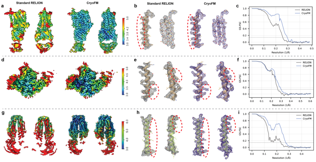 值得一提的是,研究团队在超过 10 个单颗粒冷冻电镜数据集上进行了系统评估,覆盖空间噪声不均匀、存在优势取向等多类具有挑战性的场景;在这些条件下,cryoFM 在三维重构的任务上均展现出稳定的改进效果。