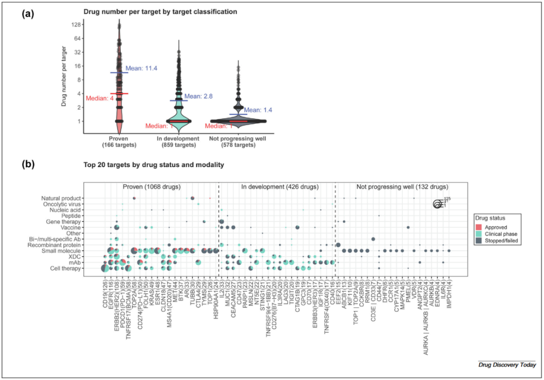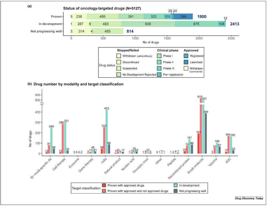 研究团队对5127个处于临床阶段或已获批的肿瘤药物及其1603个独立靶点实体进行了全面分析。该研究系统刻画了在药物治疗模式、地域分布及临床转化等层面肿瘤药物研发趋势,并提供了一个以数据为基础的分析框架,用以理解癌症药物发现不断演进的未来。