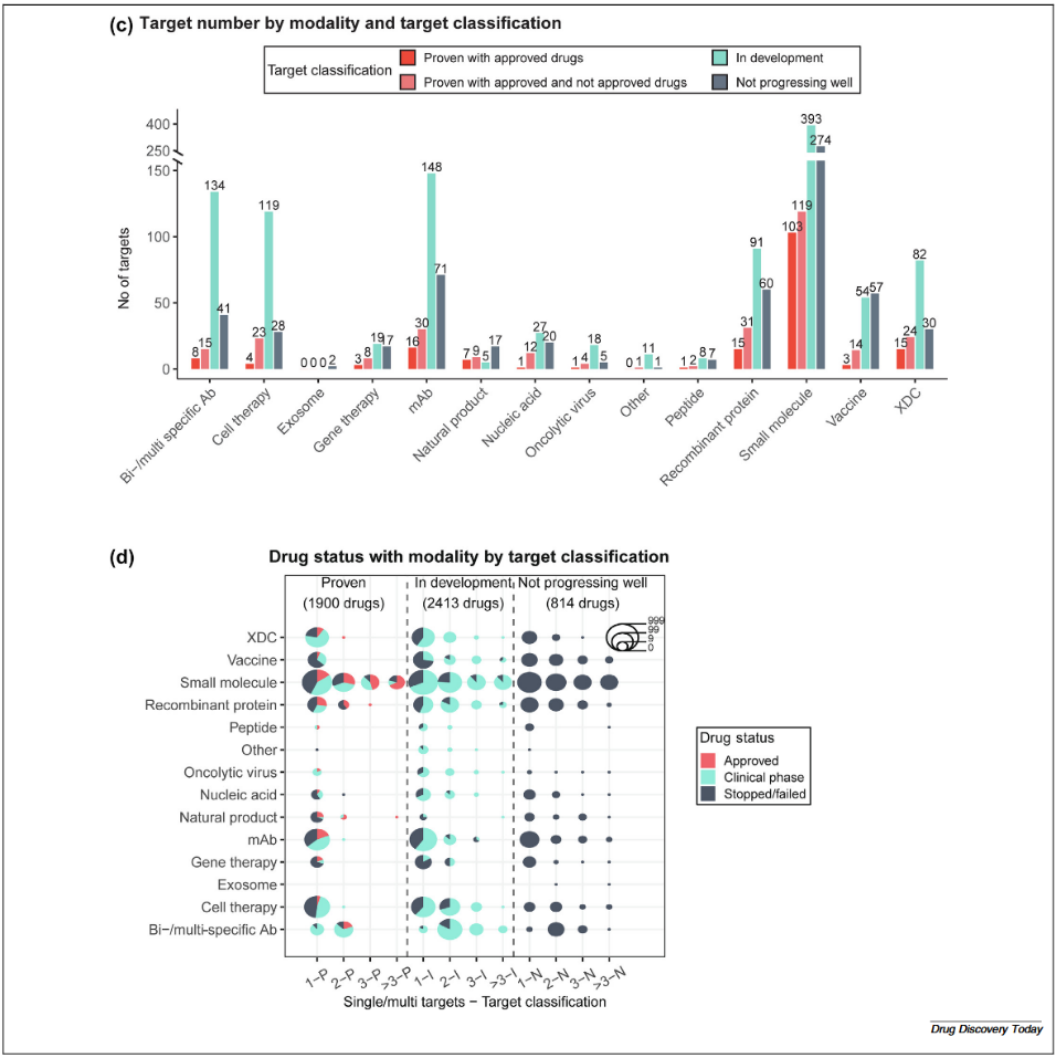 小分子药物仍是占比最高的治疗模式,在“已验证”和“研发中”靶点中分别有919种和901种药物,并且也是获批数量最多的模式。单克隆抗体(mAb)位居第二,尽管获批数量相对较少,但在活跃研发中的占比很高,凸显了其在未来研发中的巨大潜力(图2b–d)。