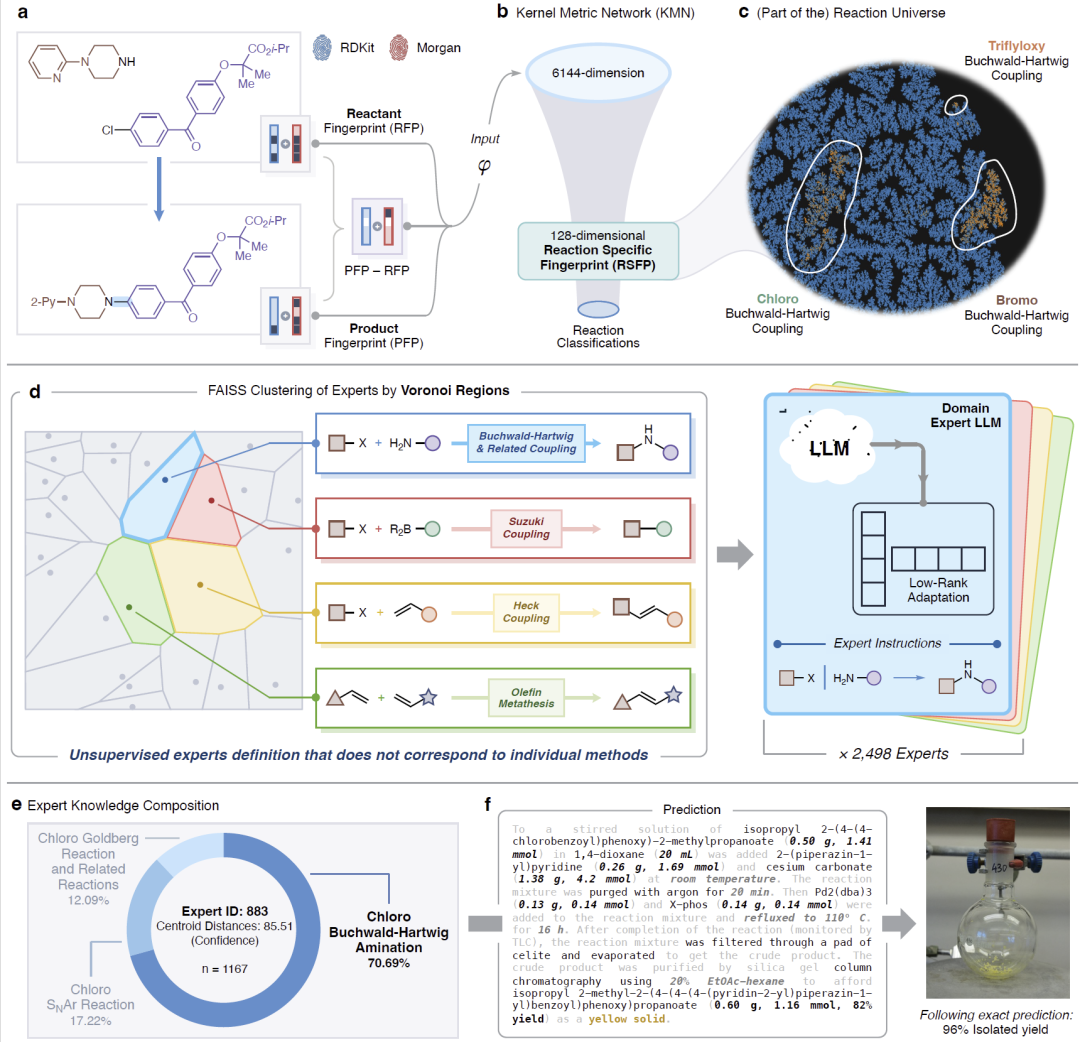 MOSAIC 首先通过反应特征编码与距离度量,将已知化学反应嵌入到统一的高维反应空间中,并利用向量检索与聚类算法将该空间划分为大量Voronoi 知识区域。每个区域对应一类相互关联的反应模式,并据此微调一个专门的语言模型专家。对于新的合成问题,系统通过相似性搜索动态选取最相关的多个专家协同生成完整实验方案,包括试剂、溶剂、计量比、温度、反应时间、后处理步骤及产率预测。同时,专家与目标反应之间的距离被用作置信度指标,用于指导实验优先级排序。