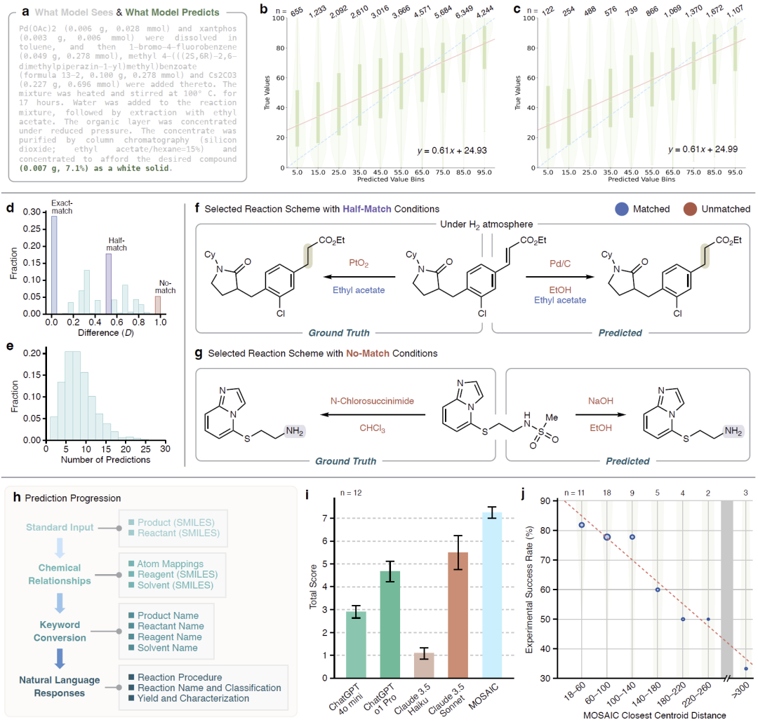 在多种经典反应类型中,MOSAIC 能够较为准确地预测反应产率区间,并在试剂与溶剂选择上显著优于通用大语言模型。引入多专家预测后,至少部分正确条件的命中率接近 95%。