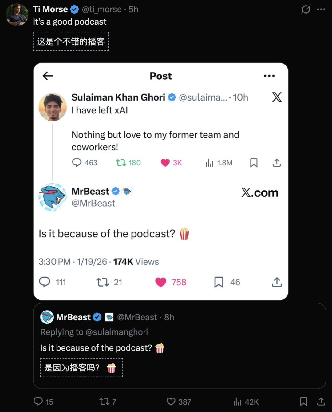 美国知名视频博主MrBeast在线吃瓜🍉,询问离职到底是不是因为播客。