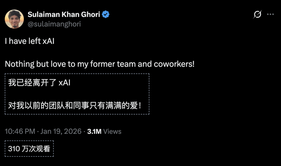 随后,Sulaiman Khan Ghori确认他已离开xAI。