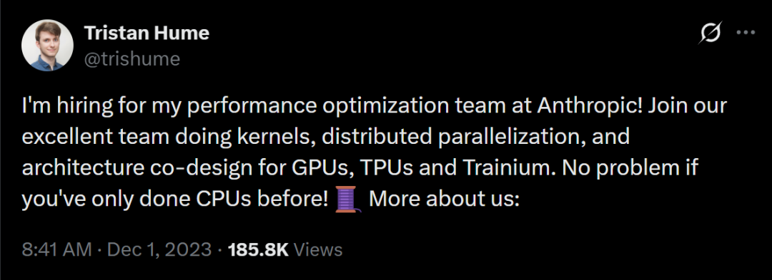 这套题在1000多名面试者中,筛出了几十个最顶尖的工程师。正是这些人,点亮了Anthropic的Trainium集群,发布了从Claude 3 Opus至今的每一个模型。