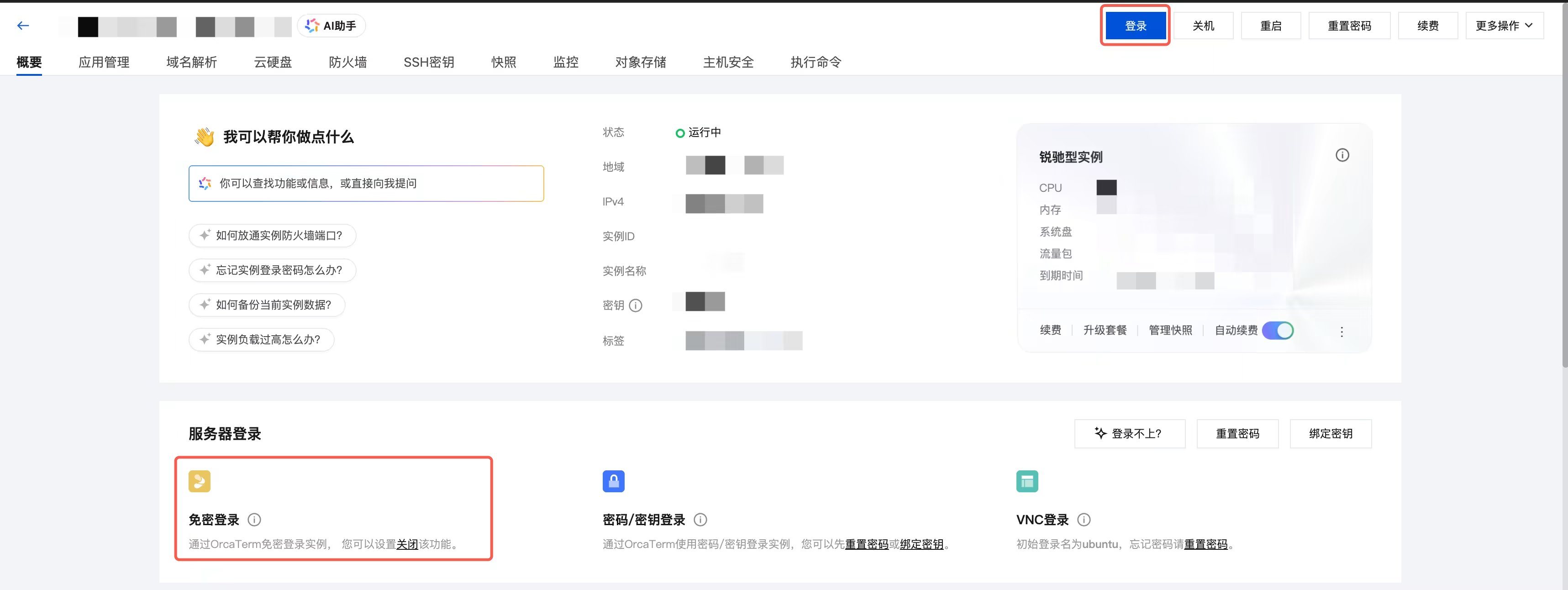 单击实例卡片进入服务器详情页,单击服务器登录中的免密登录,或页面右上角的登录。
