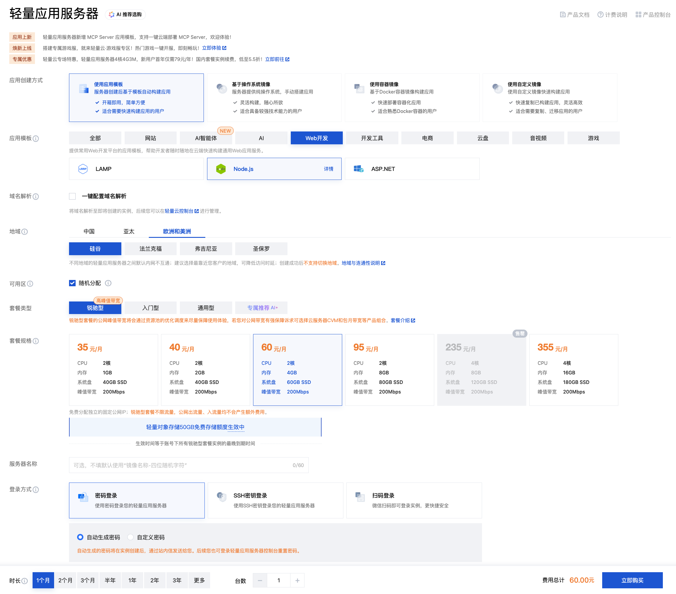 本文以腾讯云轻量应用服务器为例,首先来介绍如何进行选购: