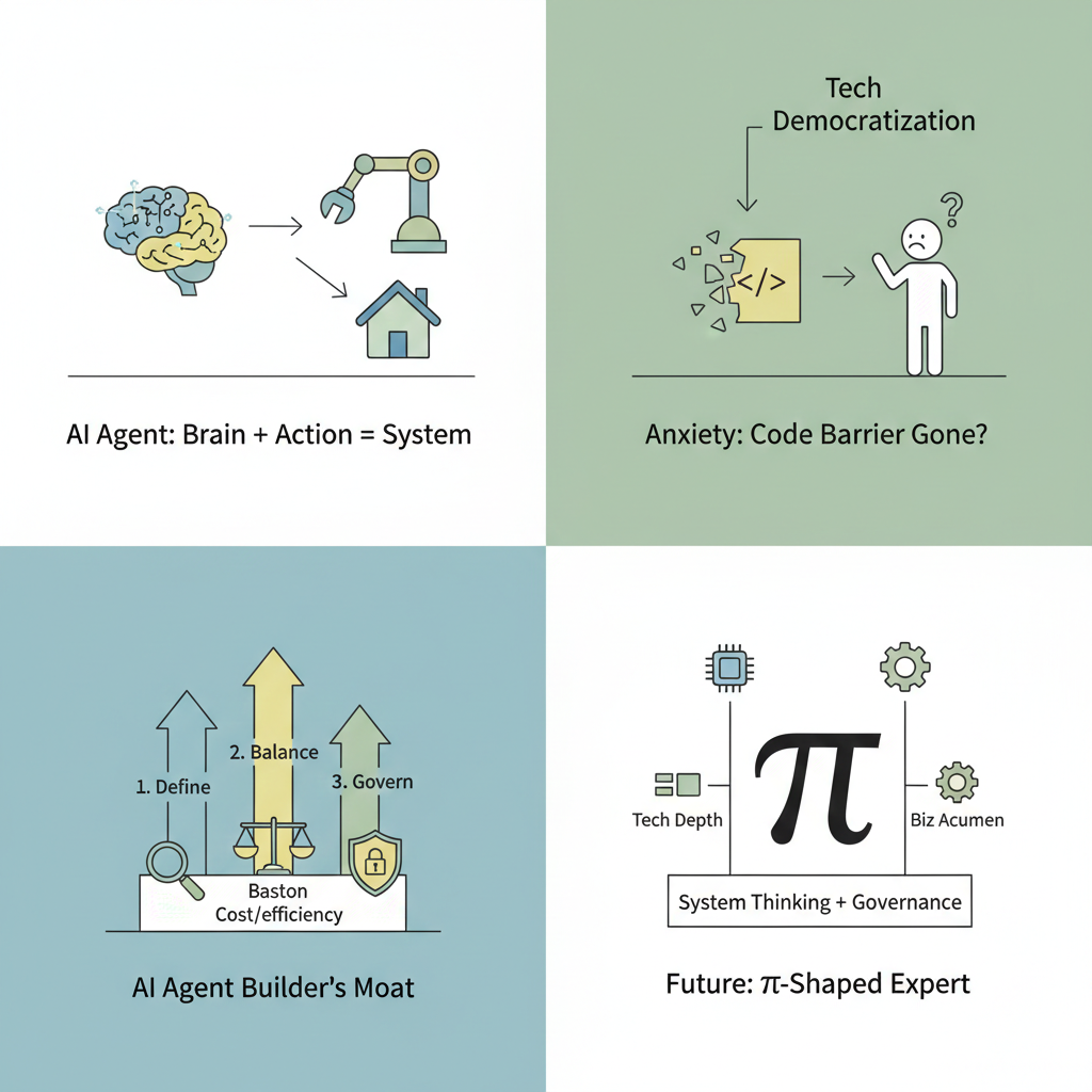 过去,熟练掌握某一编程语言、框架可能构成明确的职业护城河,但在 Agent 开发语境下,技术栈的快速迭代(从单模态到多模态、从单 Agent 到多 Agent 协同)让单纯的技术实现能力相对价值下降。相反,工程落地中难以被标准化、自动化替代的综合决策能力,正在成为搭建师的核心价值: